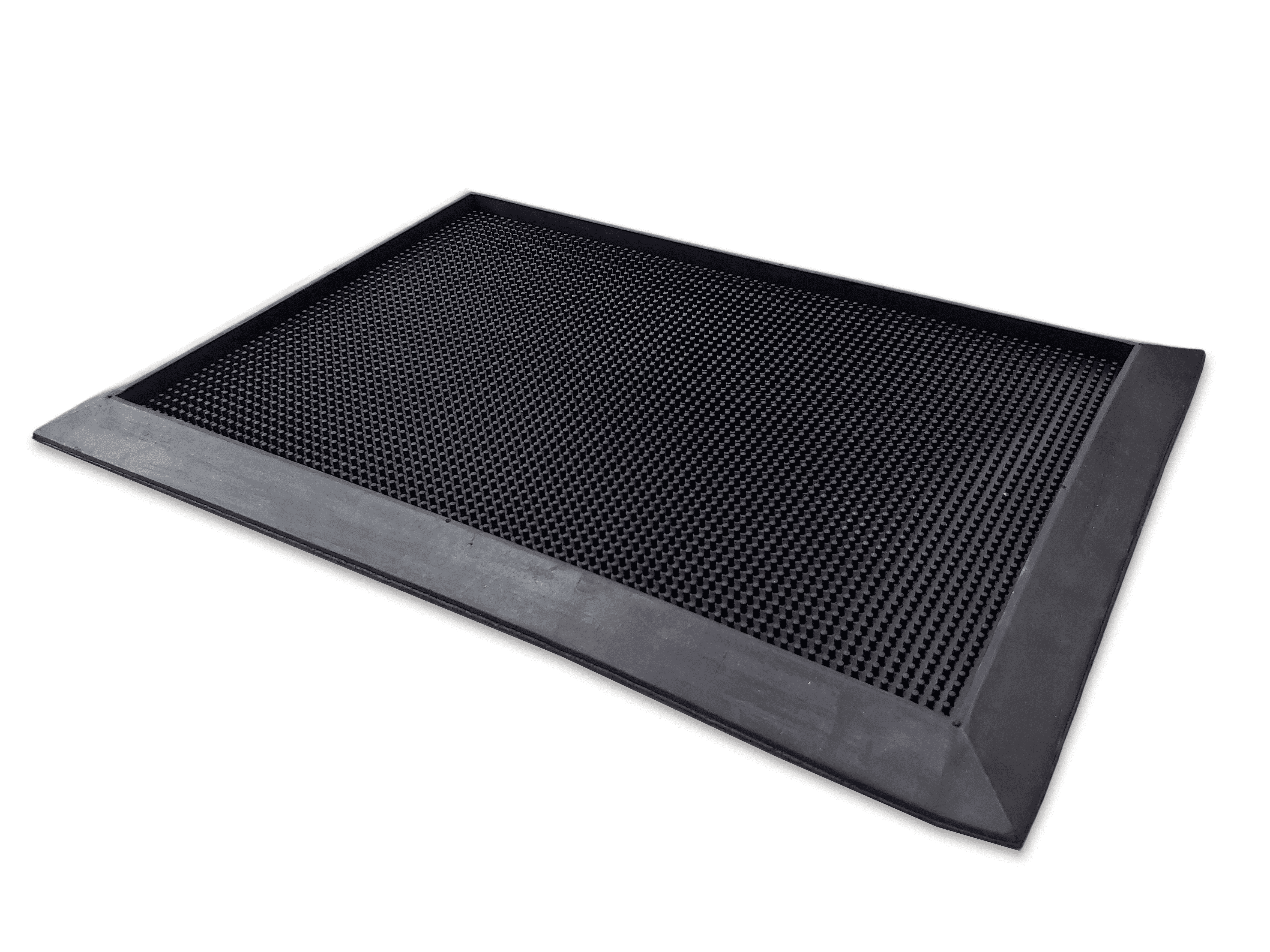 The rubber finger tips on these mats also act as an effective scrapper to keep out any large piece of debris that a visitor can bring in to the sanitized area. A thick rubber border helps keep the liquid and any captured dust/debris contained within the mat. The thick rubber construction also ensures the prevention of any leaks.